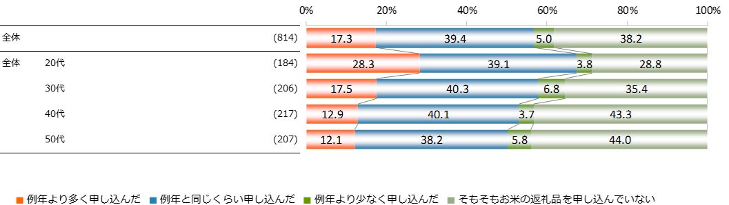 また、今年のふるさと納税で、お米を「例年通り申し込む予定」「申し込む予定はない」がそれぞれ全体の約3割だった一方、「例年より多めに申し込む予定」は10.5%に留まり、少数だった。
