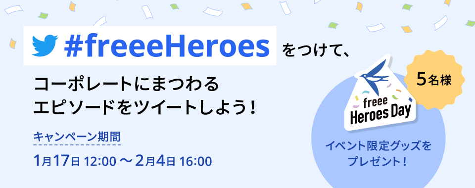 - 当選者の発表を、イベント「freee Heroes Day」にて発表いたします。また、投稿いただいたツイートからいくつかをイベント「freee Heroes Day」内でご紹介いたします。あらかじめご了承ください。