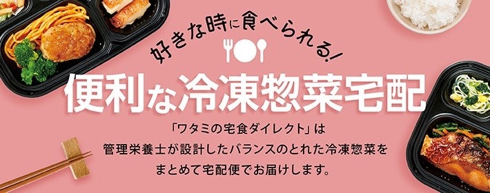 累計600万食を販売している「ワタミの宅食ダイレクト」は、管理栄養士が塩分、カロリー、品目数に配慮して設計したバランスのとれた冷凍惣菜をご自宅に宅配便でお届けするサービスです。冷蔵のお弁当宅配 No.1※1の「ワタミの宅食」ならではの経験と実績を活かした、 便利でおいしい冷凍のお惣菜として、好評をいただいております。塩分やカロリーに気を配りたい方には「食塩相当量2.0g以下」「250kcal基準」「10品目以上」(1セット平均)の3種のお惣菜「いつでも三菜」がお勧めです。その他、バラエティ豊かな5種のお惣菜「いつでも五菜」や糖質制限をしたい方にぴったりの糖質に配慮した4種のお惣菜「ロカボリック」など、それぞれのお客さまにあったお惣菜をご用意しております。宅配便でまとめてお届けしますので、冷凍庫にストックしておけば、いつでも好きな時に電子レンジで温めるだけで簡単に召し上がっていただけます。