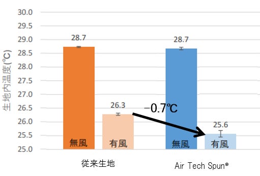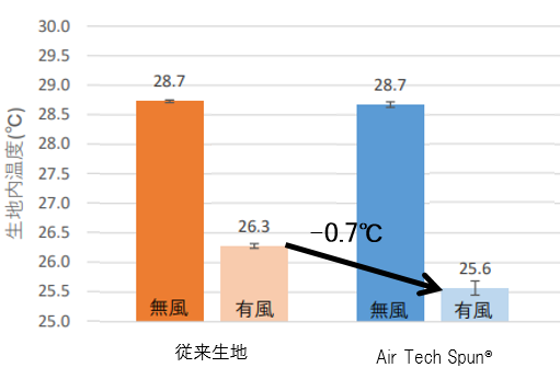 有風時の「Air Tech Spun®」と従来生地では、「Air Tech Spun®」の方が0.7℃生地内温度が低い結果となった。また、生地‐模擬皮膚間において、風を当てることで「Air Tech Spun®」は-3.1℃、従来生地で-2.4℃の温度低下が起こる結果となり、従来生地よりも「Air Tech Spun®」のほうが外気の流入が多くなることで衣服内温度が低下しやすいことが示唆された。