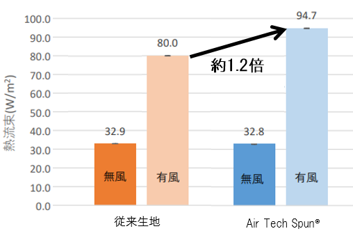 有風時の「Air Tech Spun®」と従来生地では、「Air Tech Spun®」の方が放熱量が約1.2倍高い結果となった。