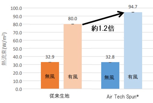 また、風を当てることにより従来生地で2.4倍、「Air Tech Spun®」で2.9倍放熱量が向上する結果となり、従来生地よりも「Air Tech Spun®」のほうが外気の流入が多くなることで衣服内の温度が下がり、皮膚からの放熱量が増加し涼しさを感じやすいことが示唆された。