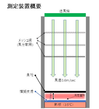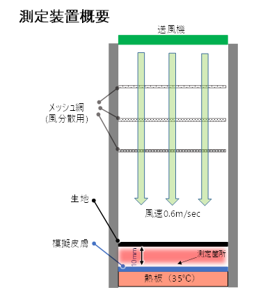 ◇概要:熱板(35℃)上に設置した模擬皮膚から10㎜の間隔を開け試料を設置し、生地上部より風をあてた時の、生地-模擬皮膚間の温度変化と、模擬皮膚から空間への放熱量を測定。