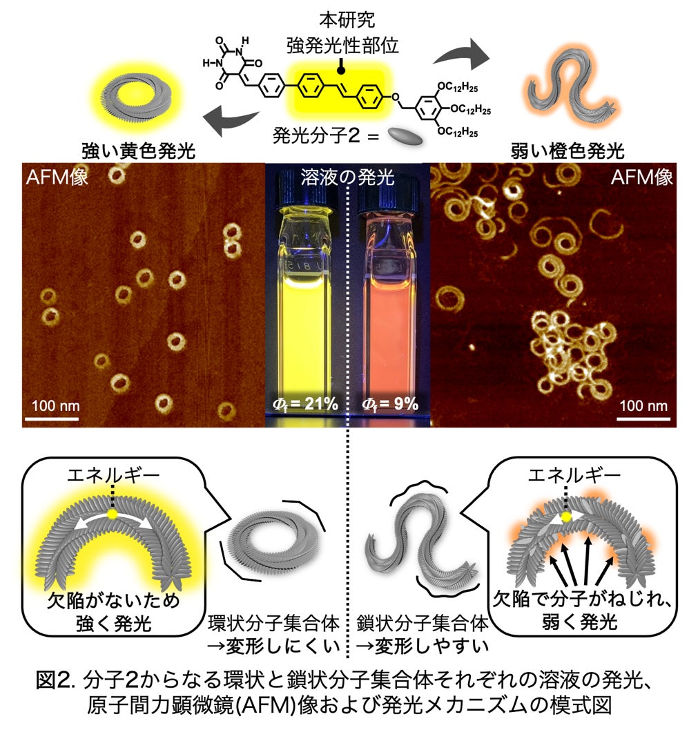 分子 2 を用いて環状または鎖状分子集合体が含まれる二つの溶液を調製し、それらの発光を比較したところ、環状分子集合体は強い黄色発光を、鎖状分子集合体は弱い橙色発光を示しました。吸収した光と放出する光の割合を表す発光量子収率Φf注2)は、環状分子集合体が21%、鎖状分子集合体が9%となり、前者が2倍以上優れた発光性能を持つことがわかりました。分子が光を放出する過程をピコ秒(10−12秒)レベルで解析した結果、この現象は、鎖状分子集合体内部の分子 2 がねじれやすく、光によって得たエネルギーが構造変化によって損なわれることが原因であることが明らかになりました。鎖状分子集合体内部の分子のねじれは、鎖状分子集合体が溶液中で変形することで生まれた「欠陥」で起きると考えられます。一方、末端のない環状分子集合体は、溶液中での変形が抑制されることで欠陥が生まれないため、強く発光できると考えられます。実際、鎖状分子集合体内部よりも環状分子集合体内部においてエネルギーが2倍以上遠くまで移動することも明らかになり、鎖状分子集合体内部に存在する欠陥がエネルギーを捉えていることが示唆されました(エネルギー移動距離:環状構造 = 8.1 nm、鎖状構造 = 3.5 nm)。