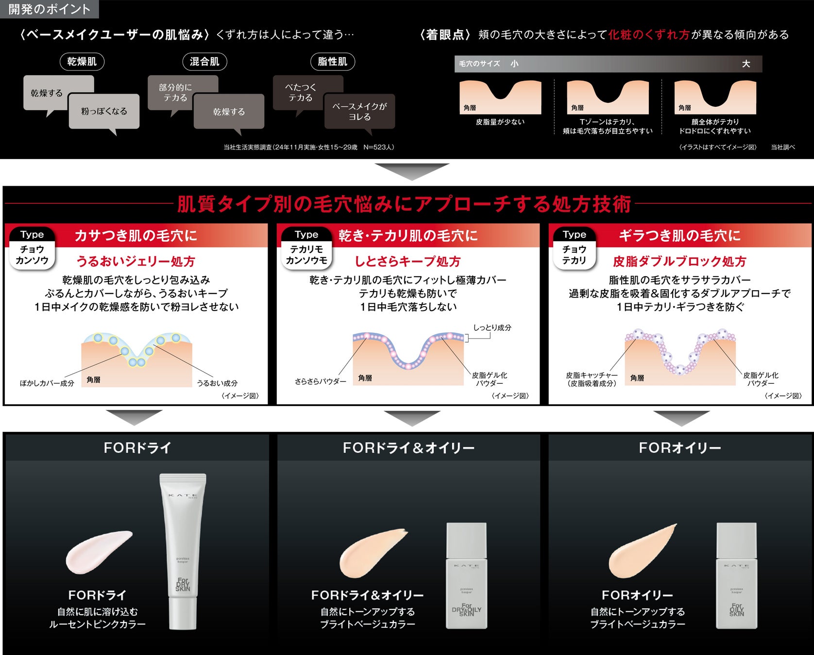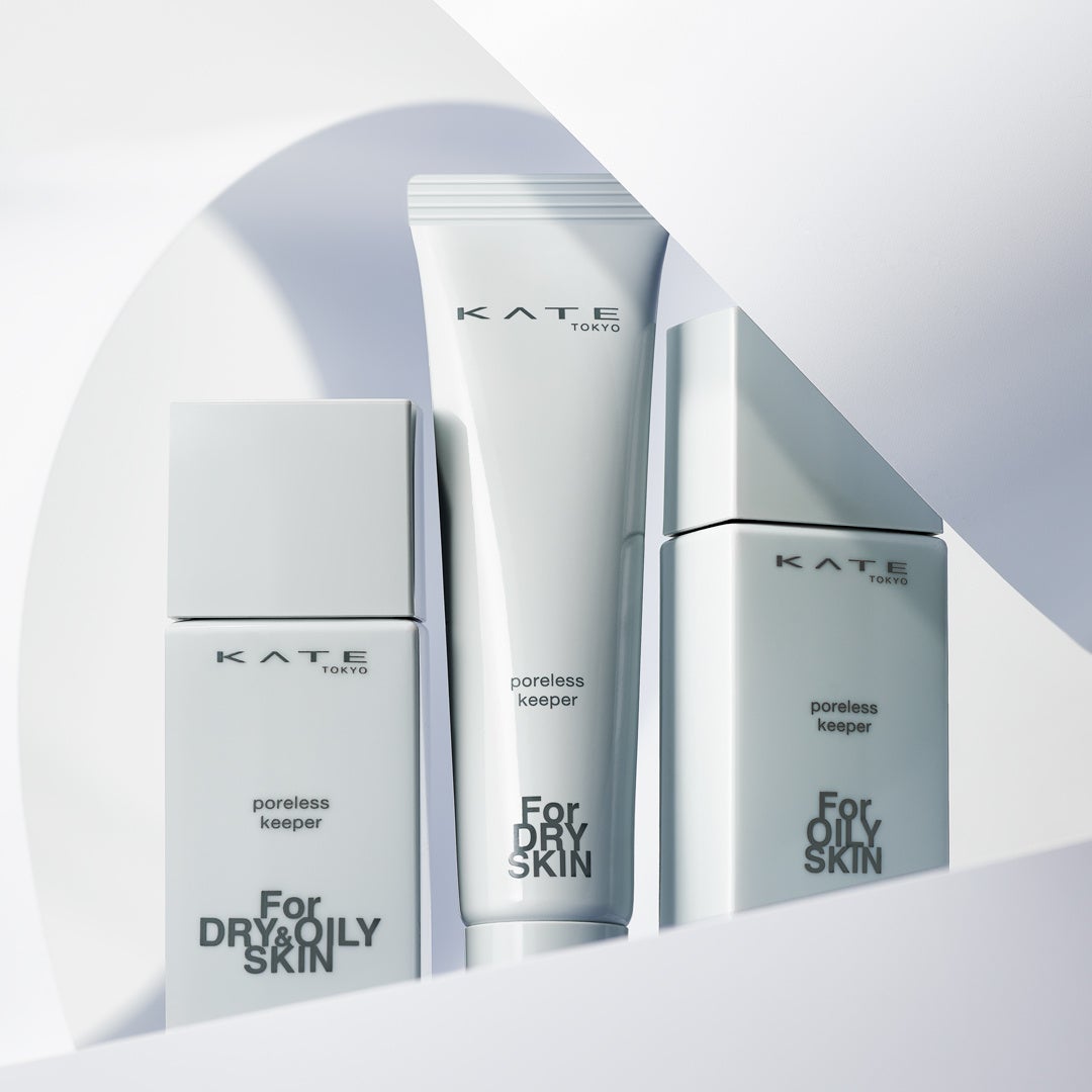 「ケイト ポアレスキーパー」は、頬の毛穴の大きさによって化粧の崩れ方が異なることに着目し、開発いたしました。乾燥肌・混合肌・脂性肌という異なる肌質ごとの毛穴悩みにアプローチする処方技術により、1日中メイク崩れを防ぎます。