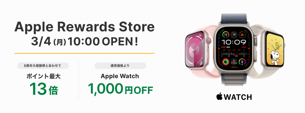 ○東日本旅客鉄道株式会社(本社:東京都渋谷区、代表取締役社長:深澤 祐二、以下「JR東日本」)と株式会社カレンティア(本社:東京都品川区、代表取締役社長:星山 薫)は、JR東日本が運営するECサイト「JRE MALL」でのお買い物をより多くのお客さまに楽しんでいただけるよう、商品の拡充に取り組んでおります。3月4日(月)より、「Apple Rewards Store」がオープンし、人気のApple製品をJRE POINTで購入することが可能となります。 ○オープンを記念して、3月4日(月)よりJRE POINT3倍キャンペーン※を実施するとともに、「Apple Watch1,000円OFF」など、特別価格を設定いたします。 ○新生活の準備にふさわしいラインナップをぜひこの機会にお買い求めください。 |
