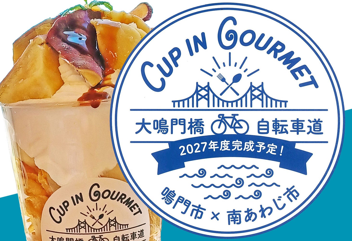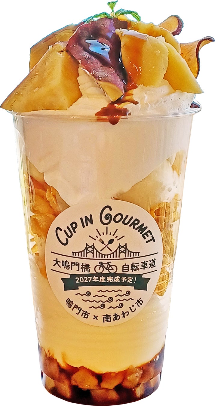 四国と淡路島を結ぶ大鳴門橋に2027年度完成予定の自転車道(サイクリングロード)を見据えて、鳴門市と兵庫県南あわじ市が共同で企画する「カップイングルメ」の一環で、テイクアウト専用メニューです。大鳴門橋や自転車などがデザインされたステッカーが目を引くカップで提供いたします。
