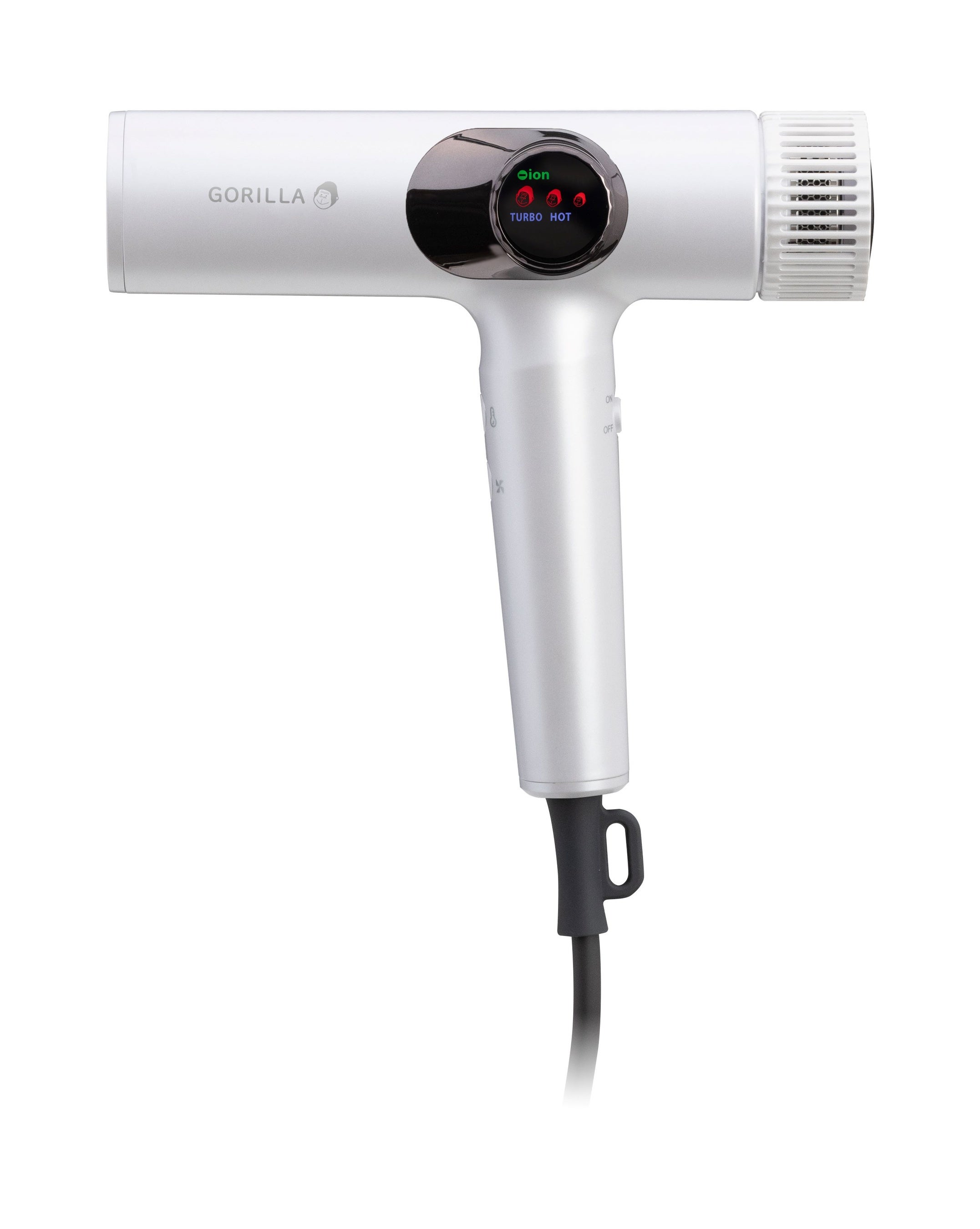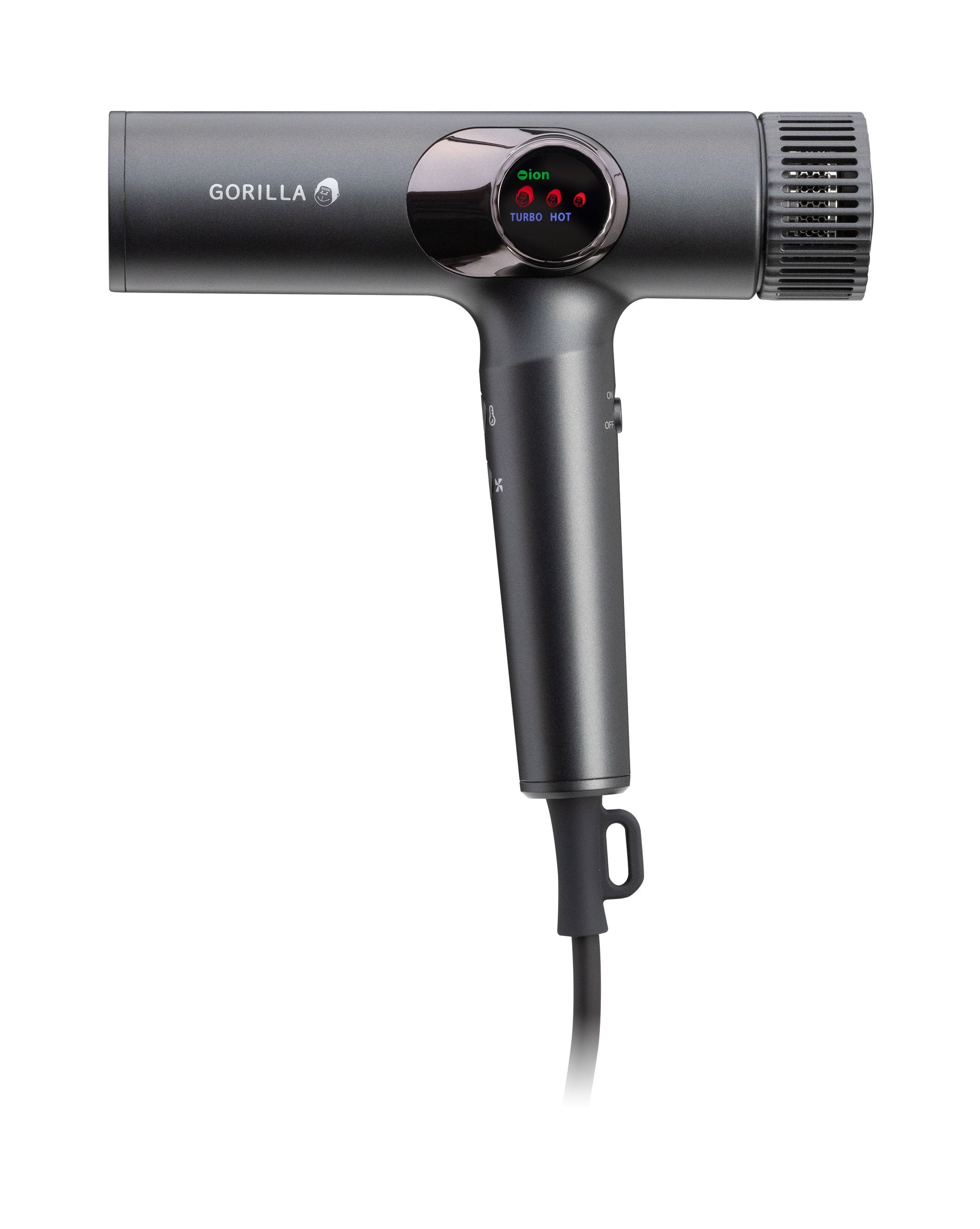 温度と風量は、本体側面のインジケーター部分にゴリラの顔アイコンで表示されます。ひと目で設定が分かるため、迷わず直感的に操作できて安心です。