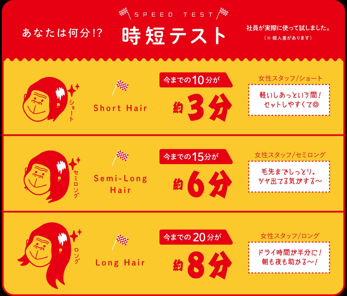 パッケージはアイコンのゴリラがドライヤーを持っているイラストと、本製品の風量の強さを伝える「その風、まさにゴリラ級!」の文字が書かれています。また、パッケージ側面には実際に様々な長さのヘアスタイルをした女性社員が使って試した時短テスト結果とその感想が書かれています。