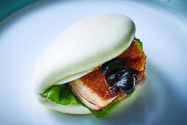 ランチタイムは桜の風味が香り、儚さも感じる優しい桃色の豆乳豆腐をご提供します。アクセントのいくらの塩味とともにお楽しみください。ディナータイムからは北京ダックをふわふわの蒸しパンで挟み、甘辛い味噌だれとお召し上がりください。満足感のある一品です。