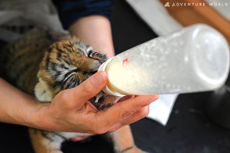 アドベンチャーワールド(和歌山県白浜町)では2024年5月19日(日)に、アムールトラの赤ちゃんが2頭誕生しました。誕生後、母親が赤ちゃんを育てる様子を観察カメラで見守っておりましたが、6日齢に育成状態を確認するため、体重測定を行ったところ想定体重に達しておらず、また、1頭に低体温が確認されたため授乳量が不足していると判断し、2頭を人工保育へと切り替えました。