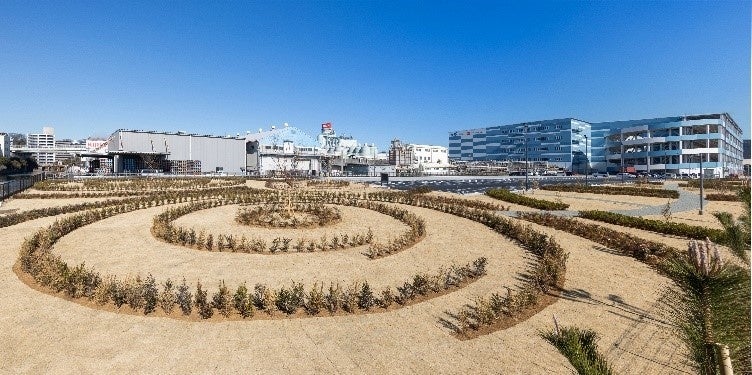 施設従業員が海面の光と海風を感じ、リフレッシュいただけるよう、敷地南西側の運河に面した部分に、約6,000㎡の緑地を整備しています。「波紋の広場」と名付け、潮風に強いシンボルツリーのシマサルスベリの木を中心に低木と芝で波紋を表現しました。