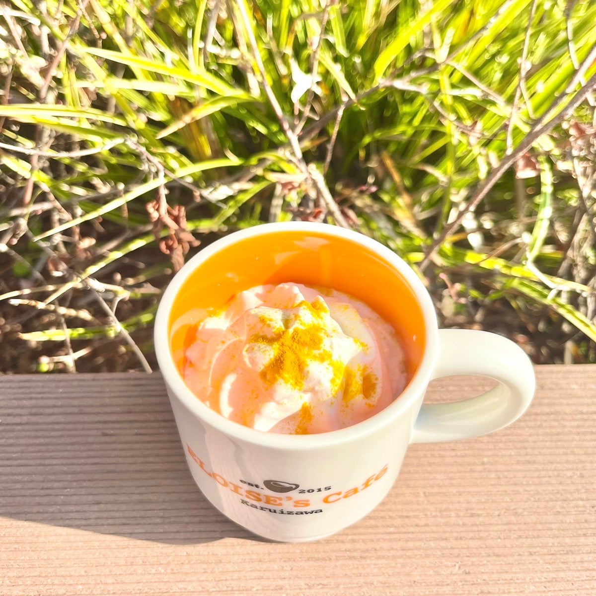 夕陽のような自家製パンプキンスープをウィンナーコーヒーのイメージでエスプーマクリームで仕上げました。 クリームの上にはターメリックを振りかけ、スープの中にも大学南瓜をアクセントに入れて仕上げました。