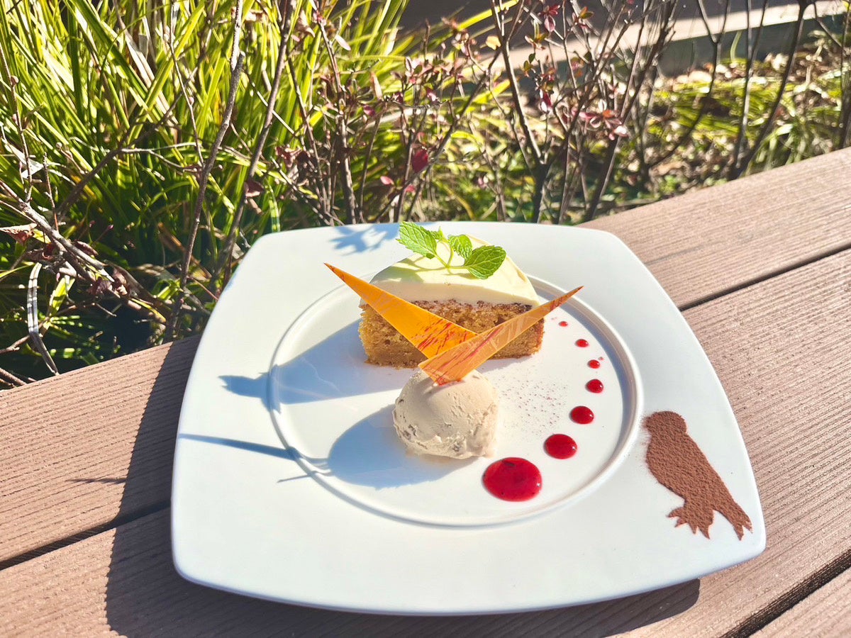 米粉で仕上げたグルテンフリーのケーキでシナモンの香りを纏わせています。 アイスクリームは、渋川栗のアイスを使っています。