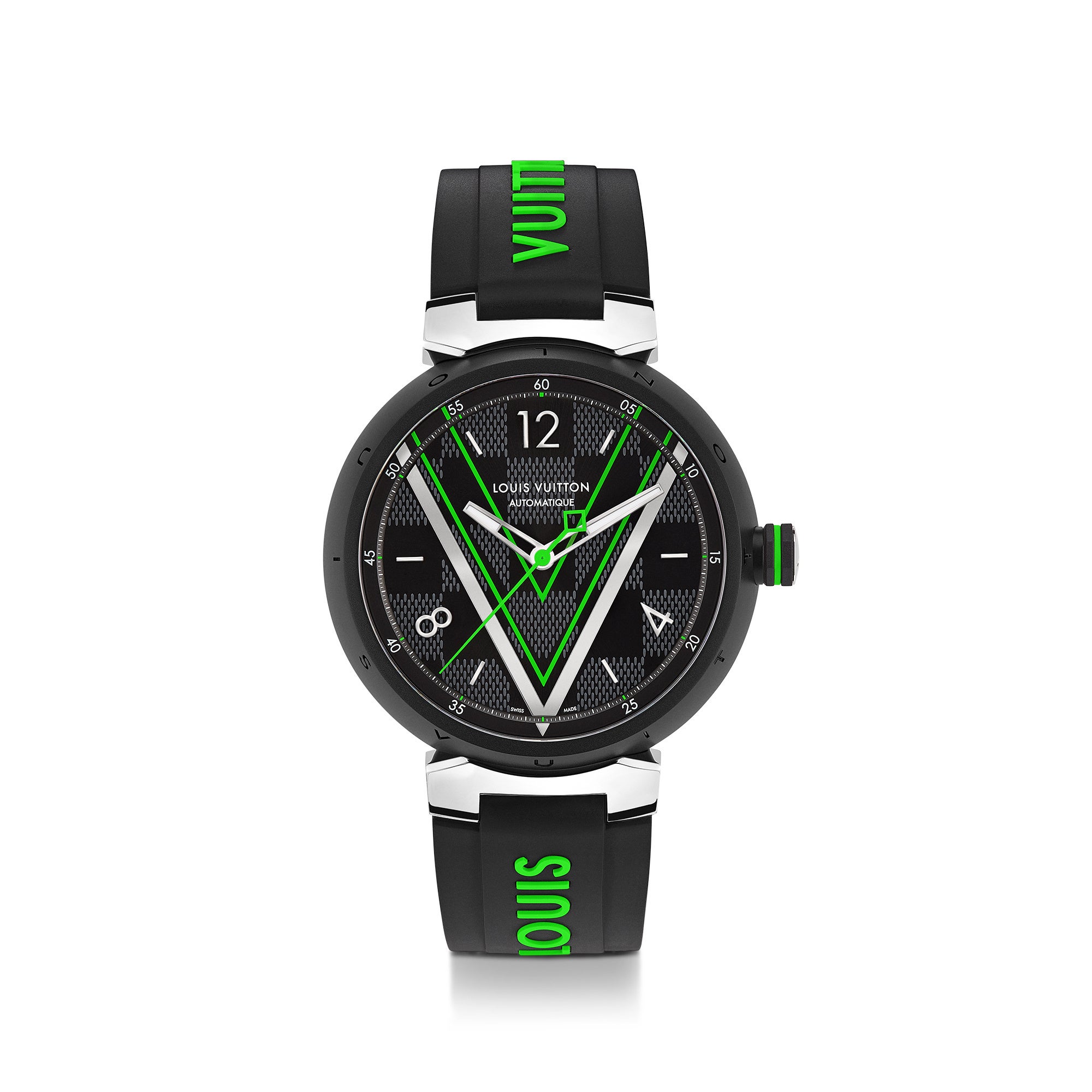 ルイ・ヴィトンを象徴するウォッチ「タンブール」の新バージョン「タンブール オトマティック ダミエ・グラフィット レース」。メゾンのアイコニックなダミエ・グラフィット キャンバスから着想を得た、カジュアル & スポーティな装いに最適のアイテムです。文字盤全体にあしらわれたガストン-ルイ・ヴィトンならではの「V」シグネチャーが、メゾンのエスプリを体現しつつモダンなひねりを加えます。ブラック、シルバー、ネオングリーンのコントラストが目を引く、大胆でフレッシュなタイムピースです。