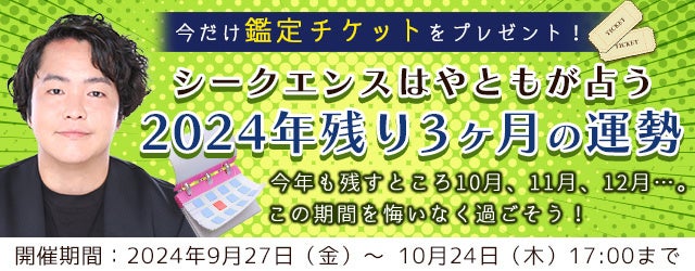 2024年残り3ヶ月の運勢|霊視芸人シークエンスはやともが占う全体運。公式占いサイトにて、2024年残り3ヶ月の運勢キャンペーン公開中