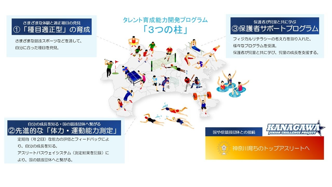 県では、競技スポーツのすそ野拡大や、将来の神奈川育ちのアスリートの早期からの発掘・育成及び計画的な競技力向上を図ることを目的として、ゴールデンエイジといわれる児童を対象としたタレント発掘・育成事業「かながわジュニアチャレンジプロジェクト」を実施しています。