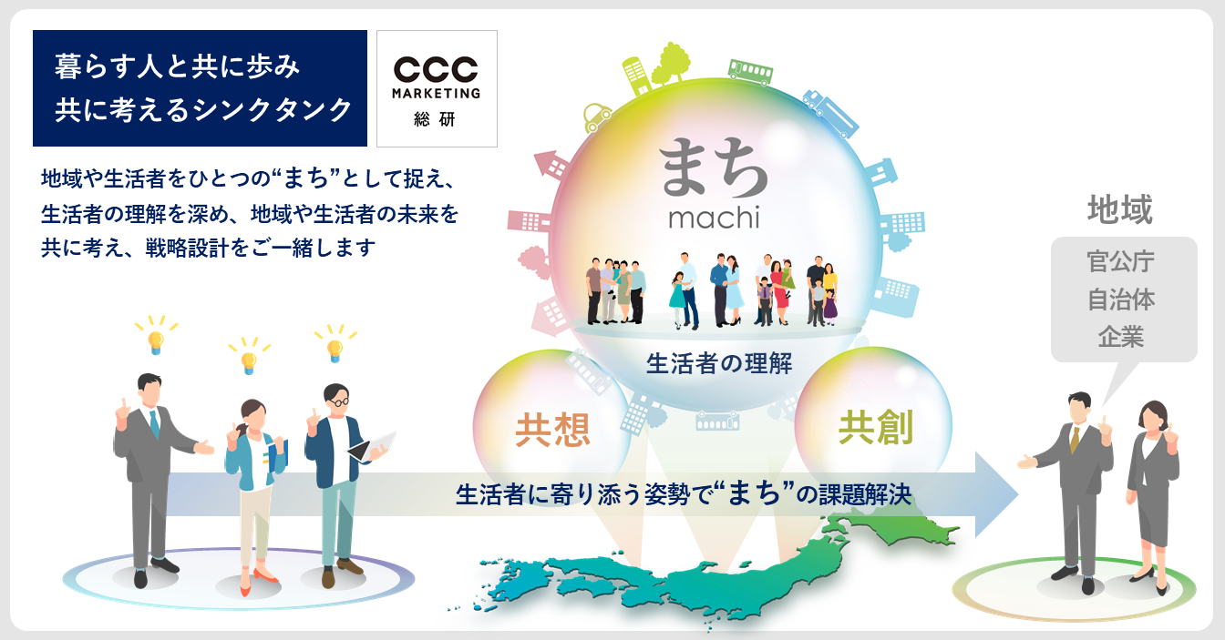 CCCマーケティング総研では、今後、生活者の声を顕在化させた「まち」のブランドイメージ調査などの各種調査サービスや官公庁、自治体・企業に対するコンサルティングサービス、外部企業と連携したコンソーシアムによるまちづくりなど、独自の視点と生活者に寄り添う姿勢で「まち」の課題解決を行ってまいります。