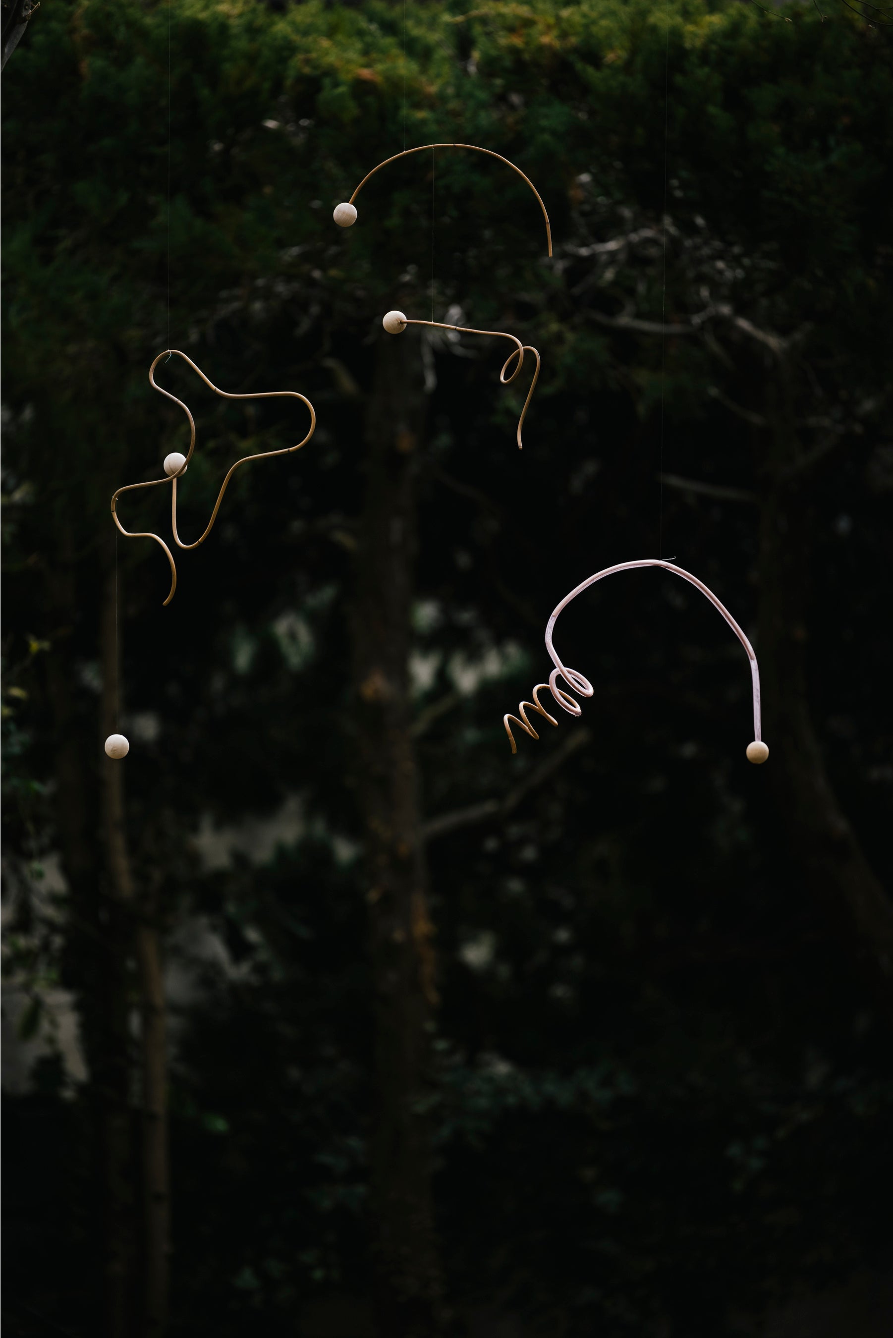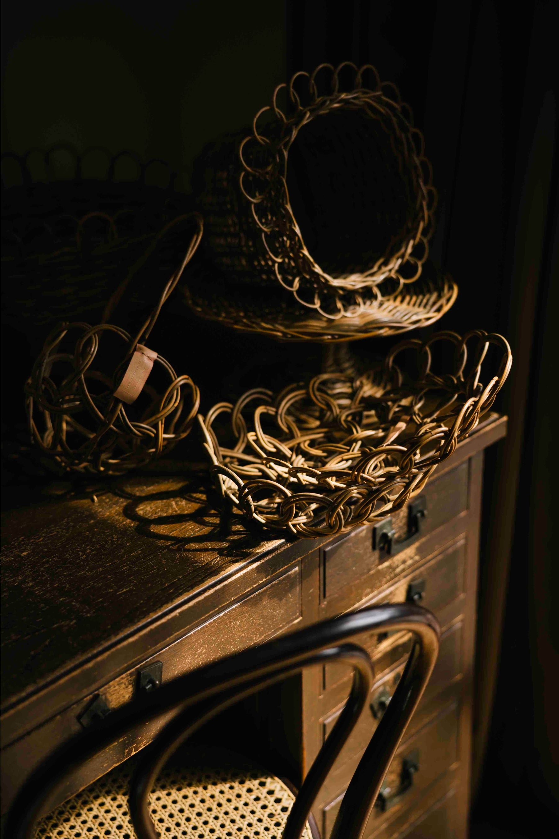 紅藤と呼ばれる不揃いな自然の藤を編み込んでオーナメントやバッグ、アクセサリーを制作。