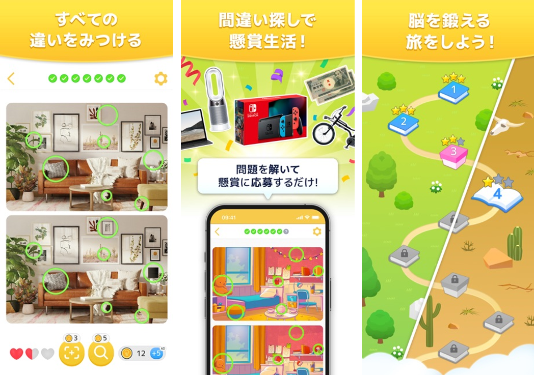 イラストや写真の豊富なバリエーションの間違い探しに加え、アイテム探しも同アプリ内で楽しむことができます。遊んだ後は懸賞に応募して豪華懸賞品をゲット!会員登録は一切不要!簡単&シンプルな操作で誰でも気軽にプレイできます。