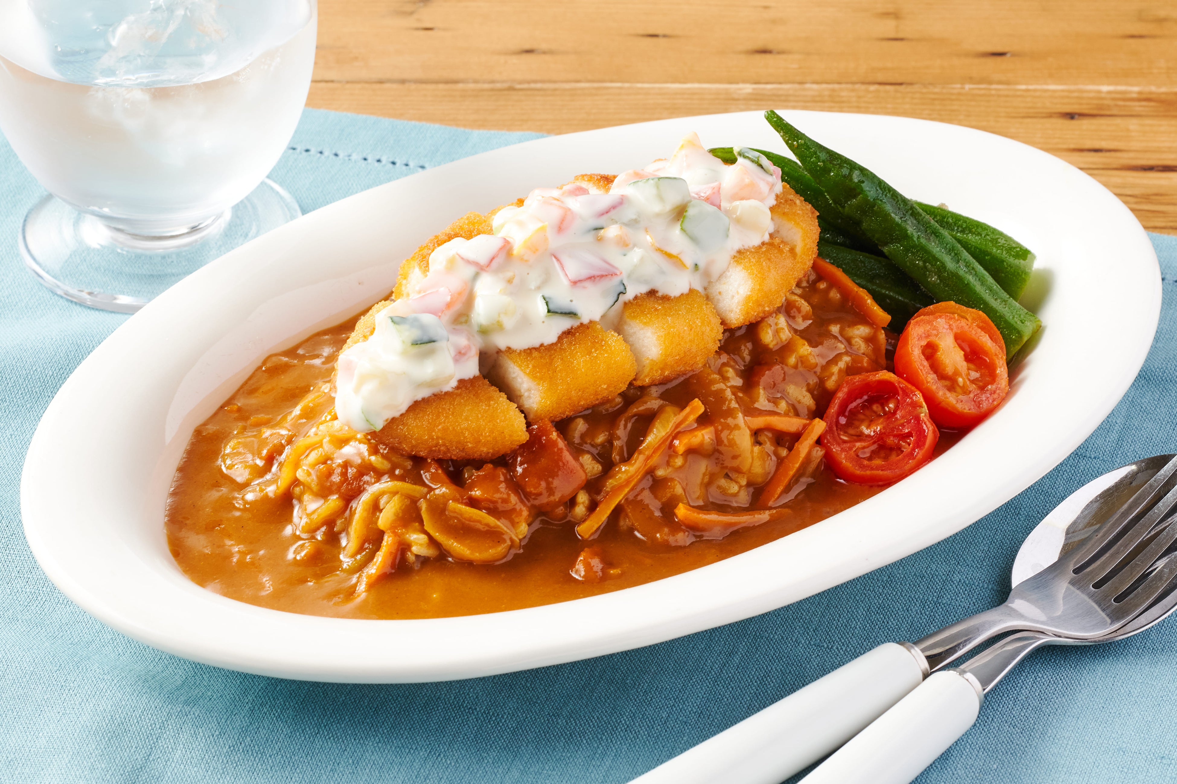 今回のコラボレーションでは、植物由来の「ソイシーカツ」を始め、野菜をたっぷりと使用したメニューにこだわりました。玉ねぎ、にんじん、トマトにりんごピューレを加えたマイルドな辛さのカレーに、豆乳クリームをベースにした、優しい味わいのOisixオリジナル「ソイマヨ」を5種の野菜に絡め、タルタルとしてトッピング。カツカレーにタルタルソースというボリューミーな見た目ながら、ひと皿ペロリと食べられるプラントベースならではの軽やかな仕上がりです。
