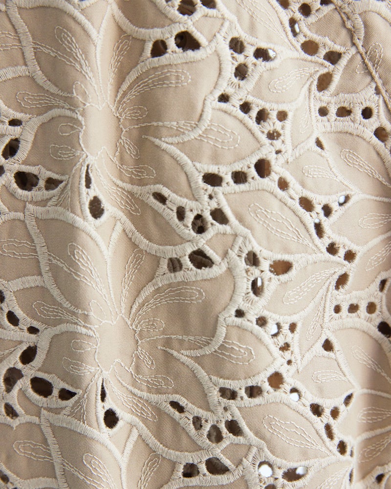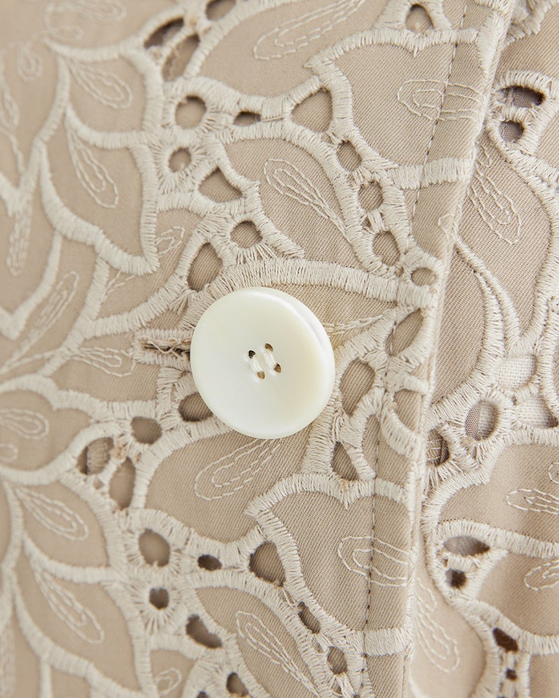 フロントや袖口に配された貝ボタンは、光を受けてやわらかく艶めき、繊細なエンブロイダリーのさりげないアクセントに。自然素材ならではの表情が、コートに優しく上質な印象をもたらします。