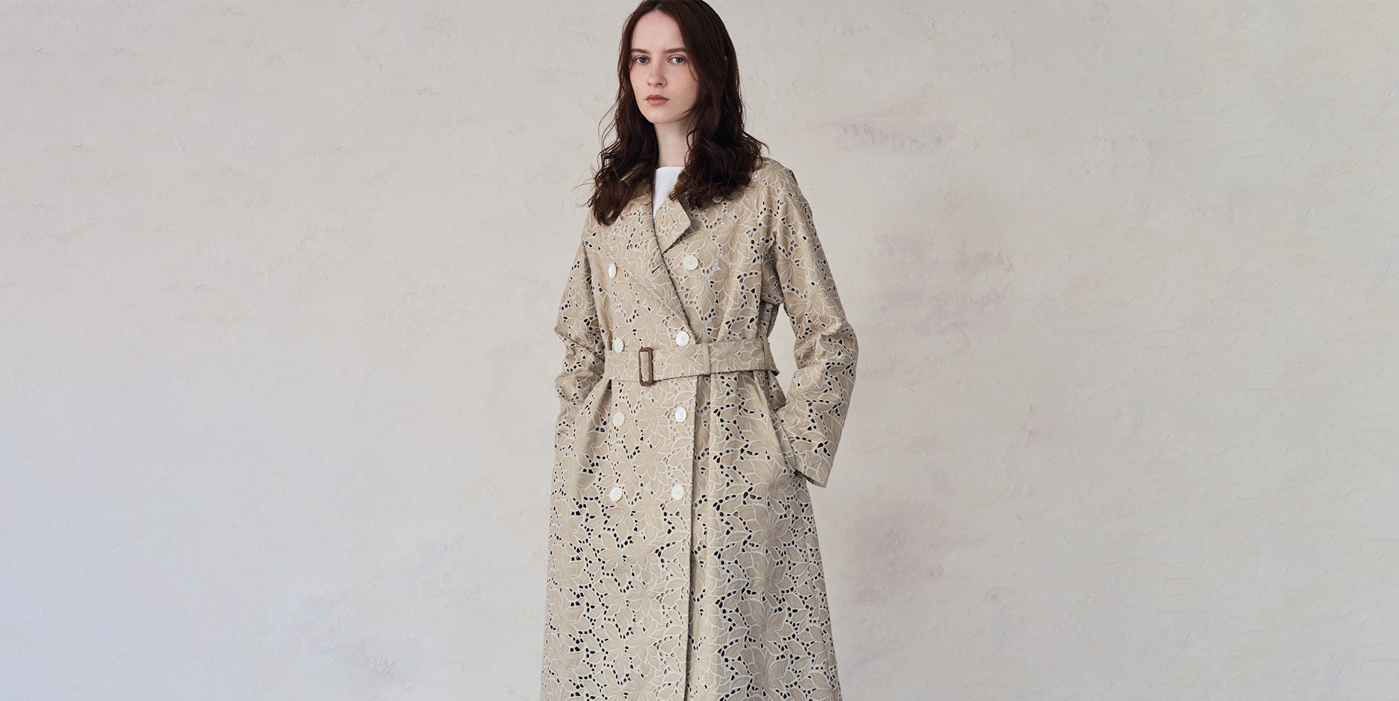 花びらが重なり合う陰影を、生地一面に描いたエンブロイダリー。モチーフは、春を告げる水仙の花。大胆なシルエットを繊細なステッチとカットワークでモダンに表現しています。生地のベースは、80番手双糸を高密度に織り上げた上質なコットンギャバジン。技巧の映える刺繍と上質な素材が重なり合うことで、トレンチコートに深みのある陰影とさりげないリズムをもたらします。