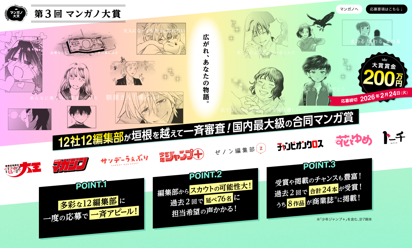 マンガ投稿プラットフォーム「マンガノ」にて、12社12編集部が参加する国内最大級の出版社合同マンガ賞「第3回マンガノ大賞」を開催。講談社、小学館、集英社などのマンガ編集部からスカウトされるチャンス!