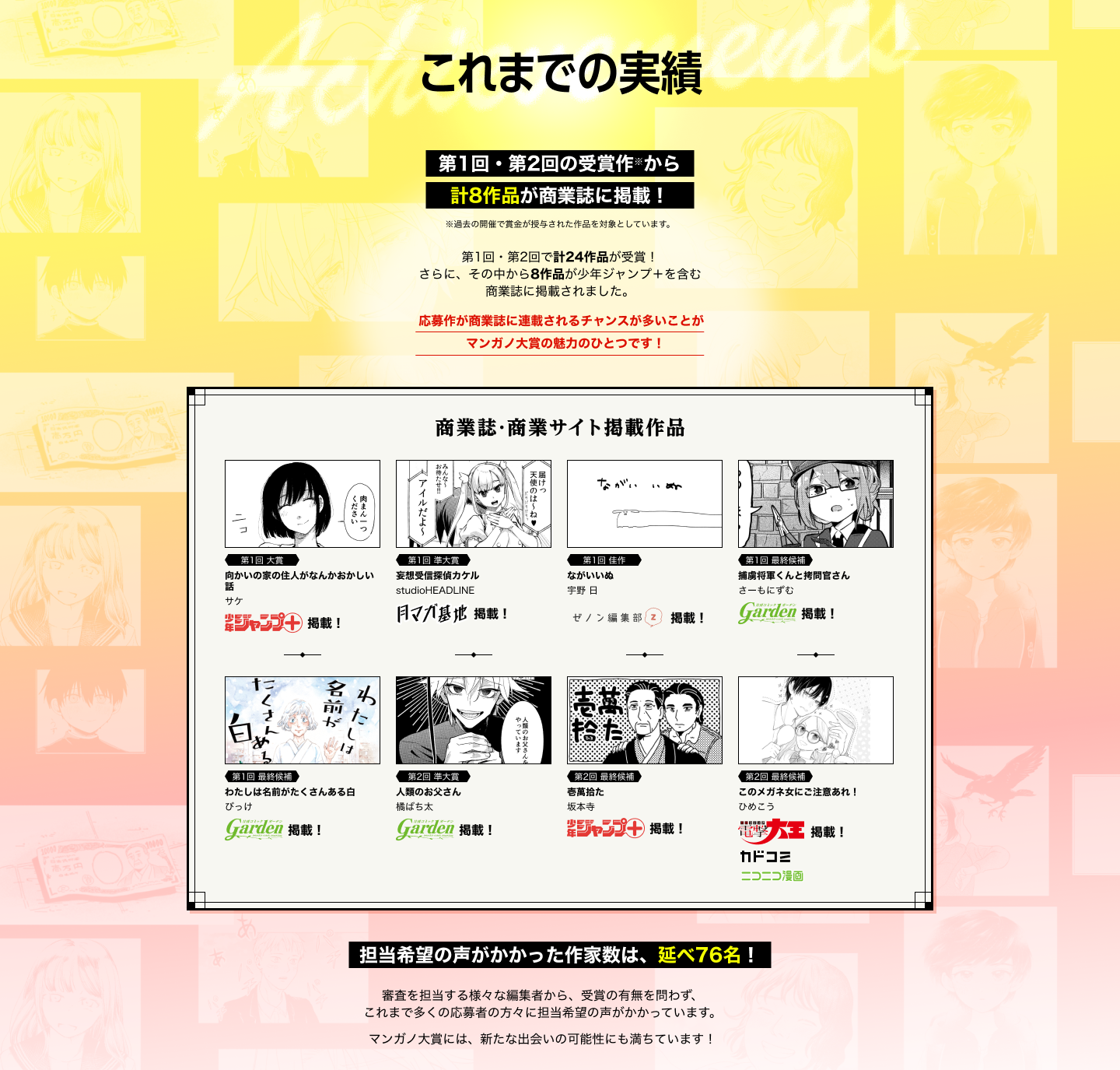 幅広いジャンルのマンガ編集部が一斉に審査。過去2回の実績として、これまでに計8作品が商業誌に掲載。延べ76名に担当希望の声がかかるなど多くのチャンスがある漫画賞。