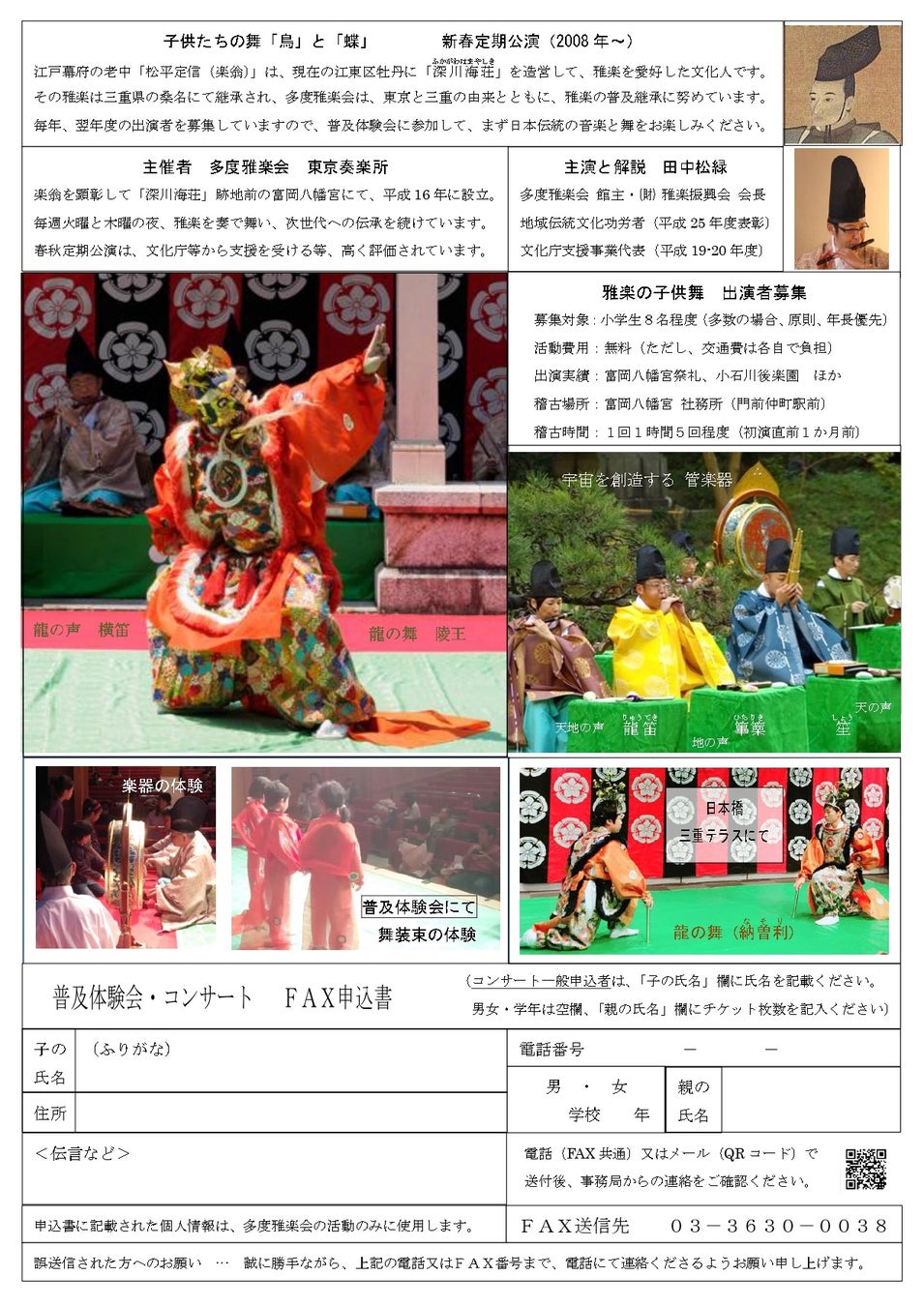毎年、江東区の子供たちを募集して深川祭で奉納する「蝶」の舞は、希少かつ美しく、小石川後楽園などでも好評を博しています。平安貴族が作曲作舞した幽玄な舞台を、琵琶や筝も加えて演出します。