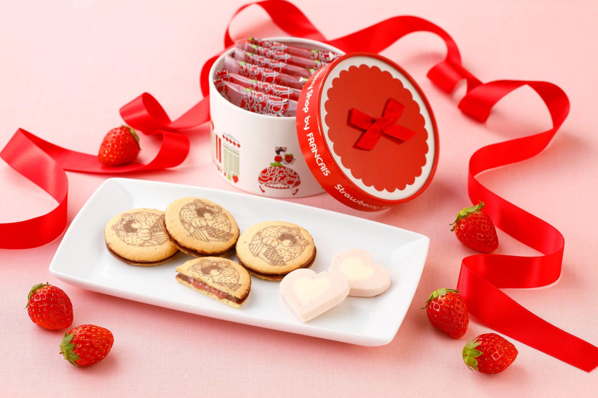 イチゴとラズベリーのペーストをスペイン産ミルクチョコレートで包み、練乳を含んだ香ばしく優しいクッキーでサンドしました。