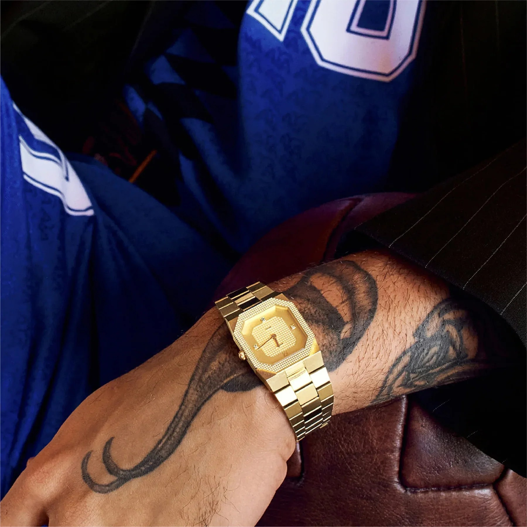 文字盤には、細かな凹凸を規則的に配置したクル・ド・パリ調のパターン加工を施しています。八角形ベゼルにも同様のテクスチャーを用い、ケースから文字盤まで統一感のある仕上がりとしています。