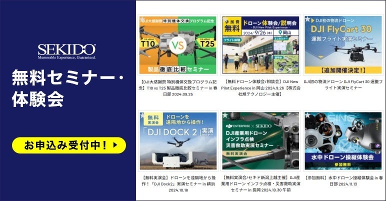 セキドでは、より多くの事業者の方にドローンを使った業務効率の改善を実現していただくため、業務用ドローンや関連ソリューションをご紹介する無料セミナーやイベントを定期的に開催しております。今後もオンラインや全国各地での開催を予定しておりますので、ご興味をお持ちのイベントにはぜひお気軽にご参加ください。