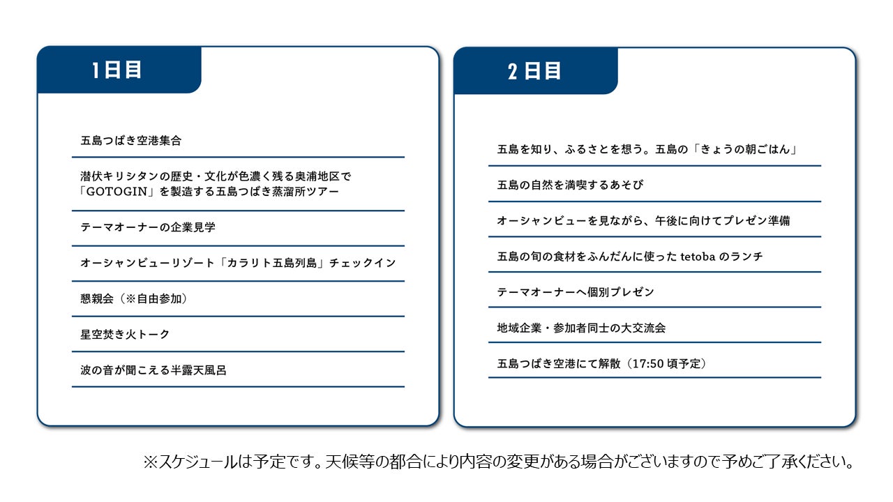 ※五島つばき空港集合後、各テーマオーナーである協賛企業の視察や観光など含む稼働手段はバスを手配します