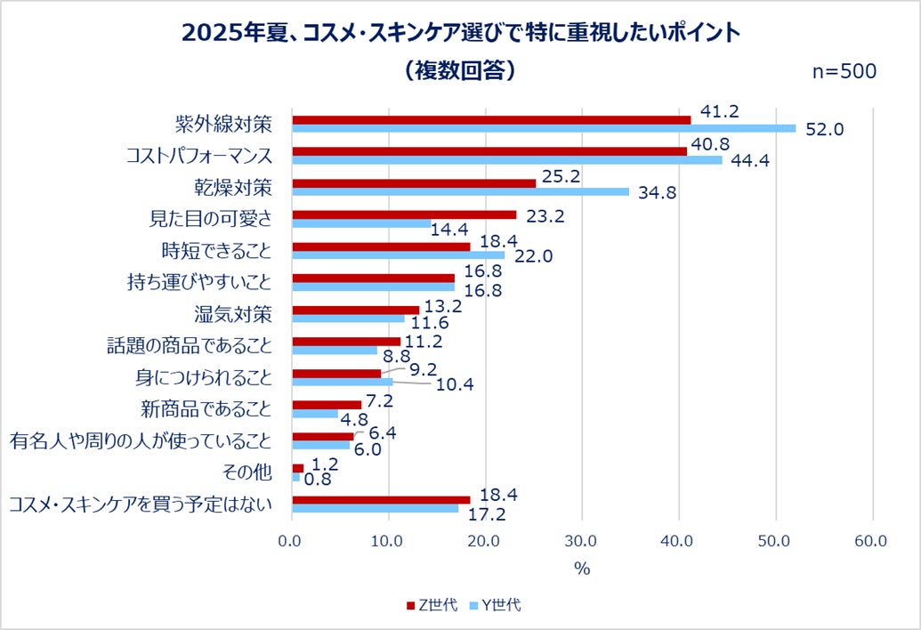 2025年夏に向けて、コスメ・スキンケア選びで重視したいポイントを聞きました。Z世代・Y世代ともに1位は「紫外線対策(Z世代:41.2%/Y世代:52.0%)」と夏らしい結果に。2位は「コストパフォーマンス(Z世代:40.8%/Y世代:44.4%)」で、質と金額のバランスは世代を問わず気になるポイントのようです。3位は「乾燥対策(Z世代:25.2%/Y世代:34.8%)でした。