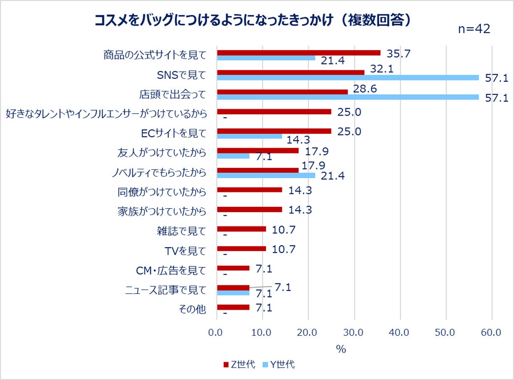 世代間で浸透率に差が見られたチャームコスメ。使っている人を対象に、その理由を聞いたところ「可愛いから・気分が上がるから(Z世代:50.0%/Y世代:64.3%)」が1位でした。つけるようになったきっかけとしては「商品の公式サイトを見て(Z世代:35.7%/Y世代:21.4%)」「SNSで見て(Z世代:32.1%/Y世代:57.1%)」「店頭で出会って(Z世代:28.6%/Y世代:57.1%)」などが上位となりました。Z世代では「好きなタレントやインフルエンサーが使っているから(25.0%)」と回答した人もいました。