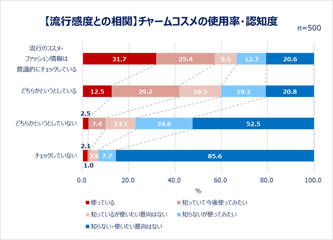 世代別で見ると、使用率・認知度ともにY世代よりZ世代の方が高い結果に。さらに「流行のコスメ・ファッション情報を意識的にチェックしているか否か」という質問への回答をもとに、流行感度別で見ると、コスメ・ファッションが好きな人ほど使用率も認知度も高いことがわかりました。
