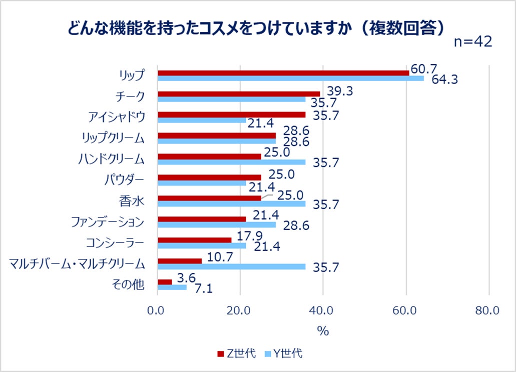 具体的にどんなコスメをバッグにつけているのか、Z世代の1位は「リップ(60.7%)」、2位は「チーク(39.3%)」、3位は「アイシャドウ(35.7%)」でした。一方Y世代は、「リップ(64.3%)」「チーク(35.7%)」がZ世代と同じく上位だったほか、「ハンドクリーム(35.7%)」「香水(35.7%)」「マルチバーム・マルチクリーム(35.7%)」も人気でした。