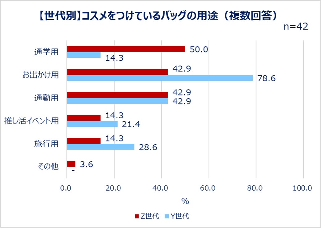どんなバッグにつけているのかも聞いたところ、Z世代は「通学用(50.0%)」、Y世代は「お出かけ用(78.6%)」が1位に。つけているコスメの数はほとんどの人が1~2個でしたが、Z世代では5個、6個、11個以上という回答も目立ちました。