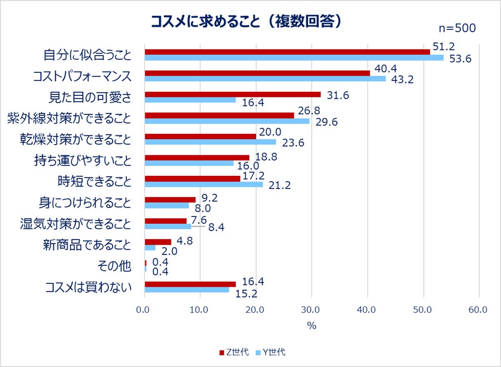 まずは、普段コスメに求めていることを聞きました。Z世代・Y世代ともに1位は「自分に似合うこと(Z世代:51.2%/Y世代:53.6%)」、2位は「コストパフォーマンス(Z世代:40.4%/Y世代:43.2%)」でした。Z世代が次いで重視する「見た目の可愛さ(31.6%)」は、Y世代では16.4%と、その差も明らかになりました。