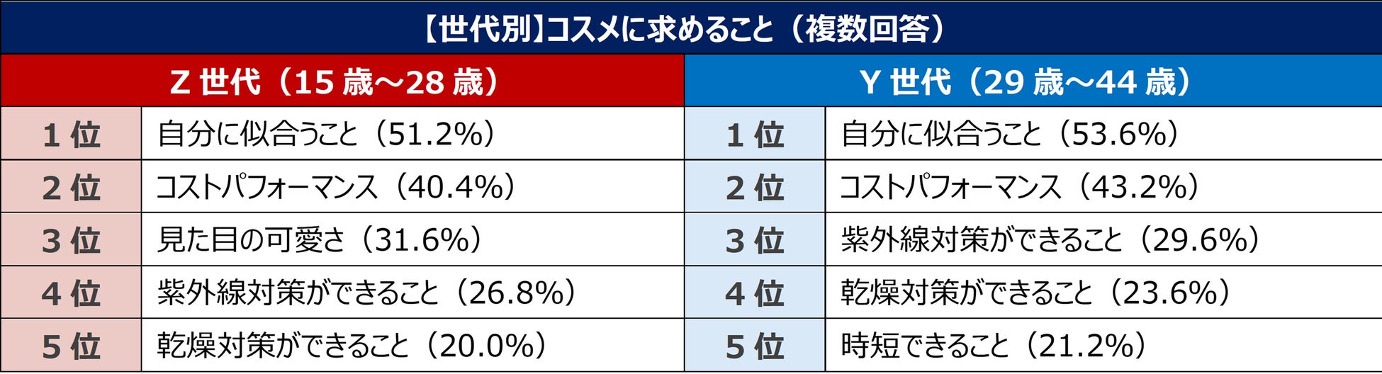 コスメはY世代よりZ世代が高め。Y世代はコスメよりスキンケアを重視したい傾向に