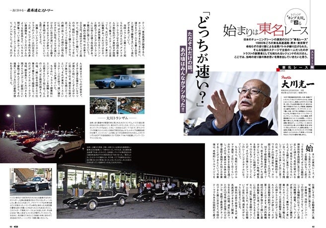 一方の『ストリート』編は、日本のチューニング黎明期に盛り上がっていた東名レースについて元トラスト幹部の大川氏が語っています。自らもトランザムのステアリングを握って走り続け、その後はJARI谷田部高速周回路での最高速テストへと没頭していく大川氏による最高速のリアルは必読です。