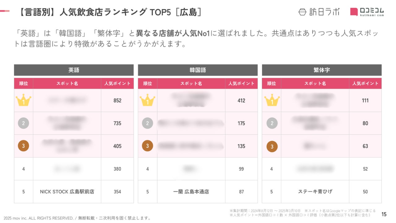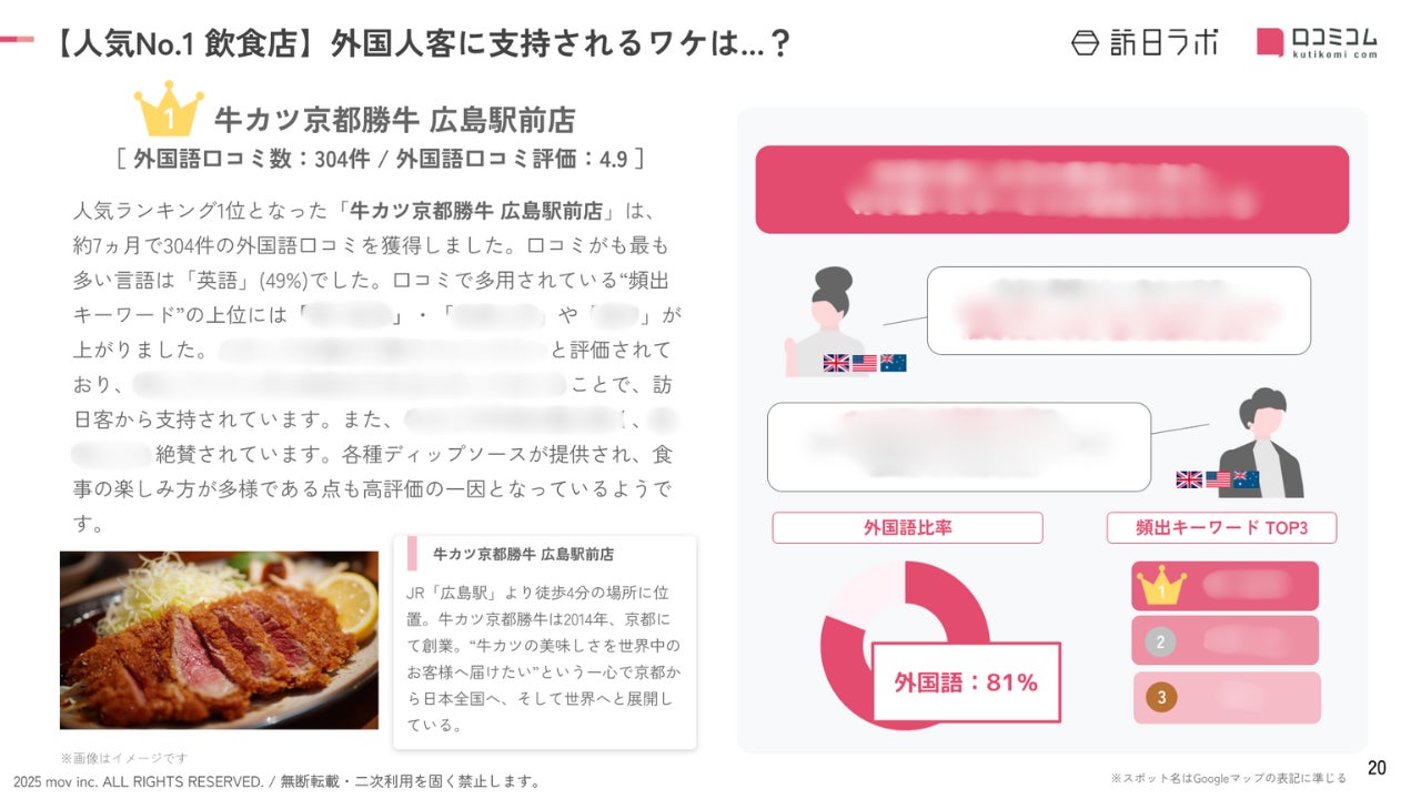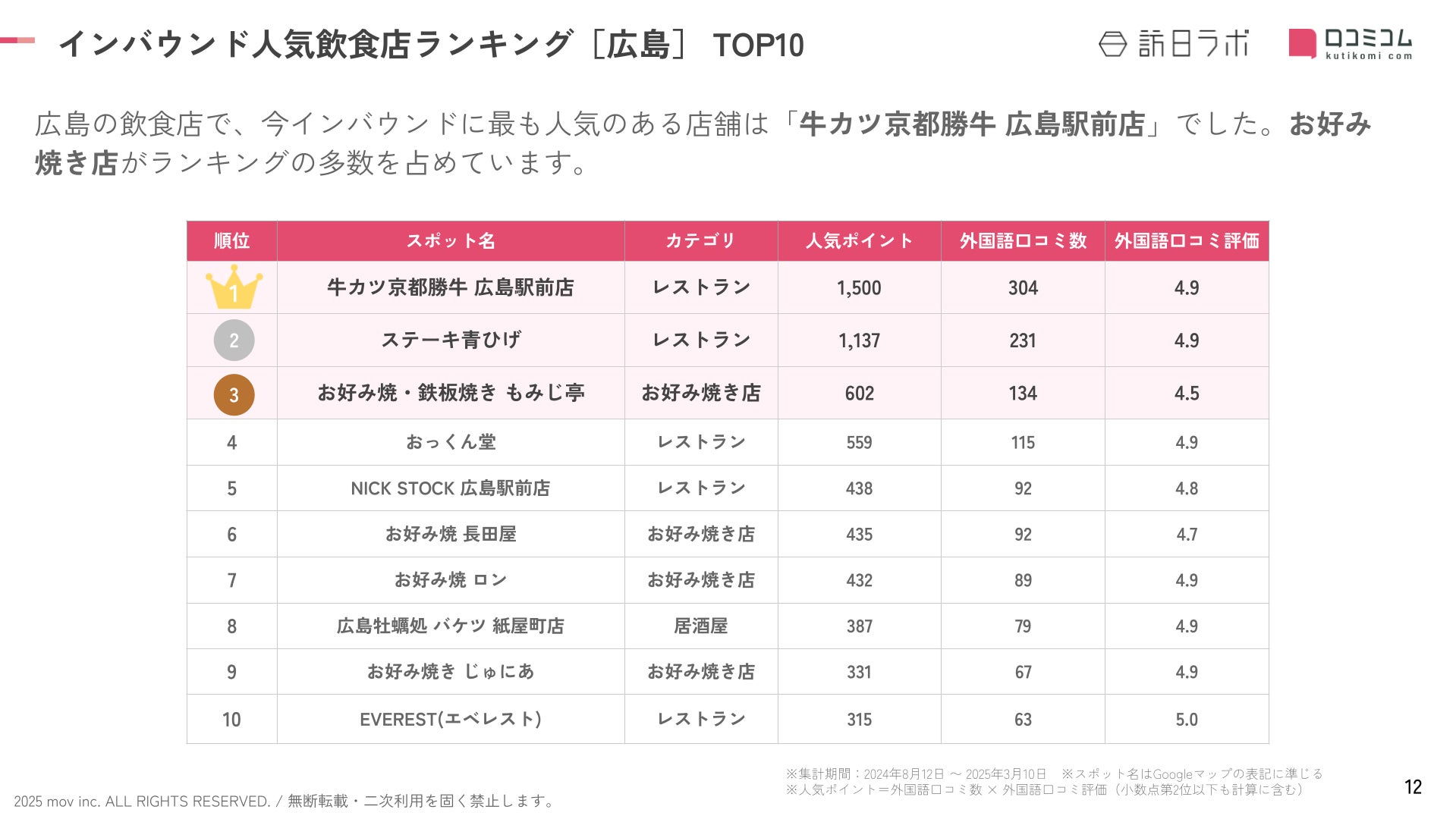 業界最大級のインバウンドビジネスメディア「訪日ラボ」及び 店舗向け集客一元化プラットフォーム「口コミコム」を運営する株式会社mov(代表取締役:渡邊 誠、本社:東京都渋谷区、以下mov)は、広島エリアの飲食店に寄せられた最新の口コミデータから、独自の『インバウンド人気観光地ランキング』を発表しました。