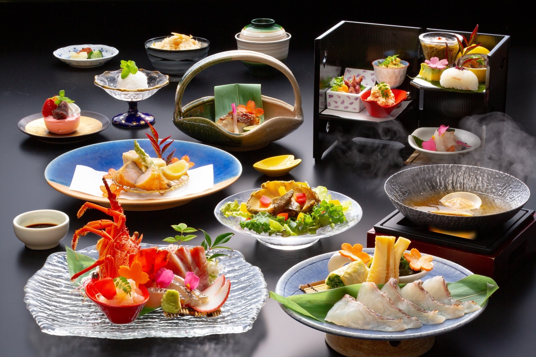 伊勢海老や鳴門鯛など、鳴門と南あわじの旬の海鮮を厳選し、福を招くように縁起の良い料理に仕上げました。お食後の最後に、なると金時とフルーツを使った和甘味をどうぞ。