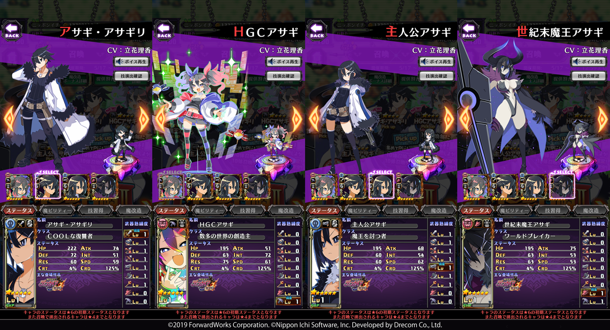 本ストーリーイベントは、日本一ソフトウェアの人気キャラクター「アサギ」とのコラボ第2弾として、新たなアサギが多数登場する『魔界戦記ディスガイアRPG』オリジナルの物語です。コラボ第1弾で登場した「主人公アサギ」や「クリエイターアサギ」、「世紀末魔王アサギ」はもちろん、男性の姿となった「アサギ・アサギリ」や大人しそうな少女姿の「恋霧アサギ」など、個性豊かなアサギが登場し、ラハールたちとのハチャメチャな魔界節エピソードが楽しめます。