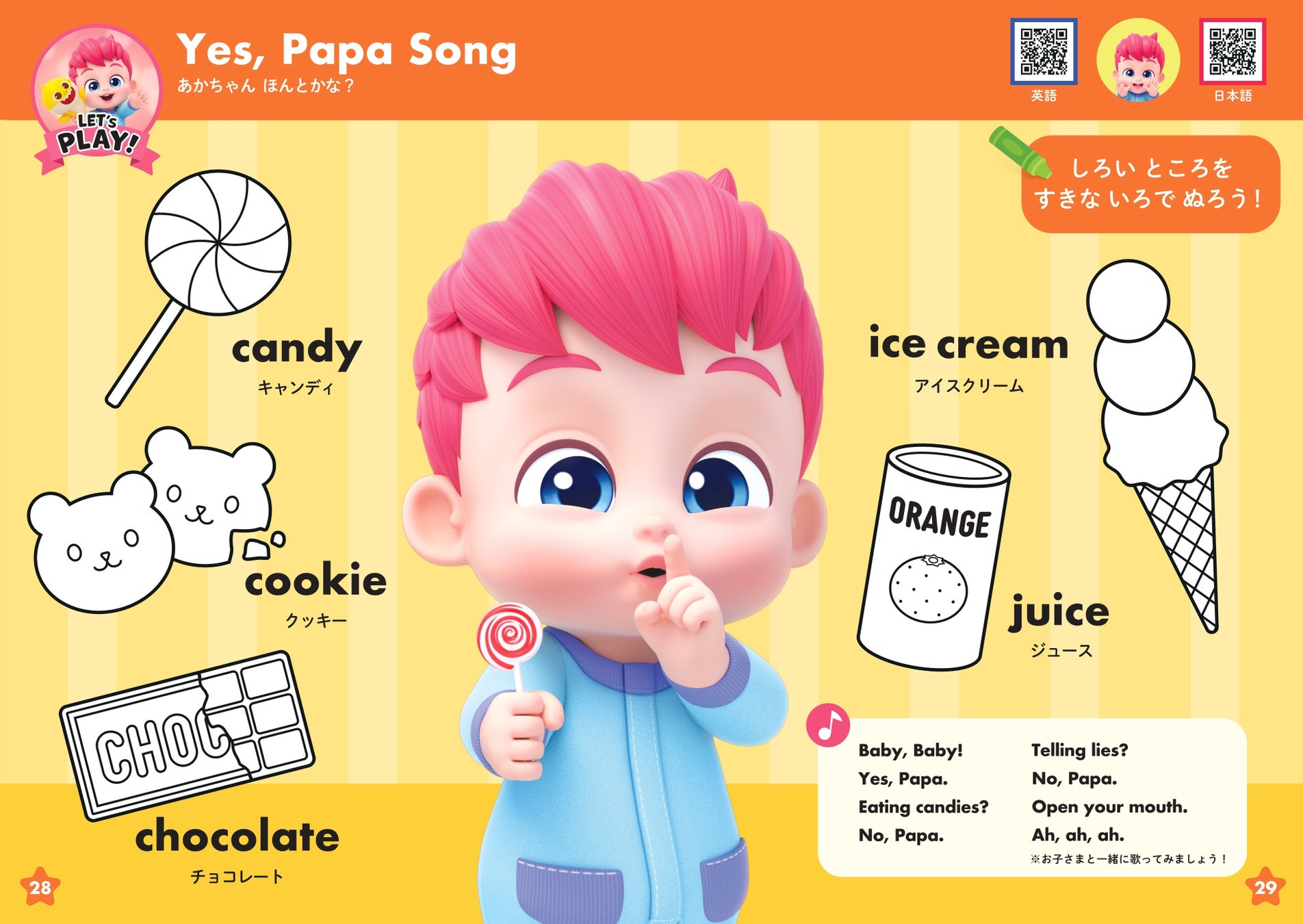 さらに、ワークブックには歌詞にあわせた数字・色・野菜など身近な英単語やフレーズを掲載。ぬり絵や迷路など幼児期に合わせたワークを通じて、楽しく英語を学べる仕組みが盛り込まれています。