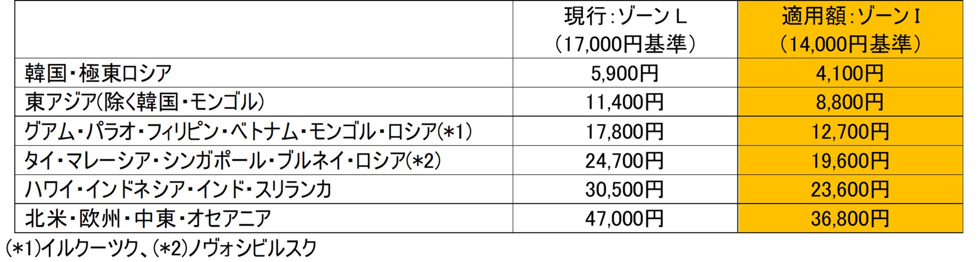 運賃額 : 日本発旅程 (金額はお一人さま一区間片道あたり)