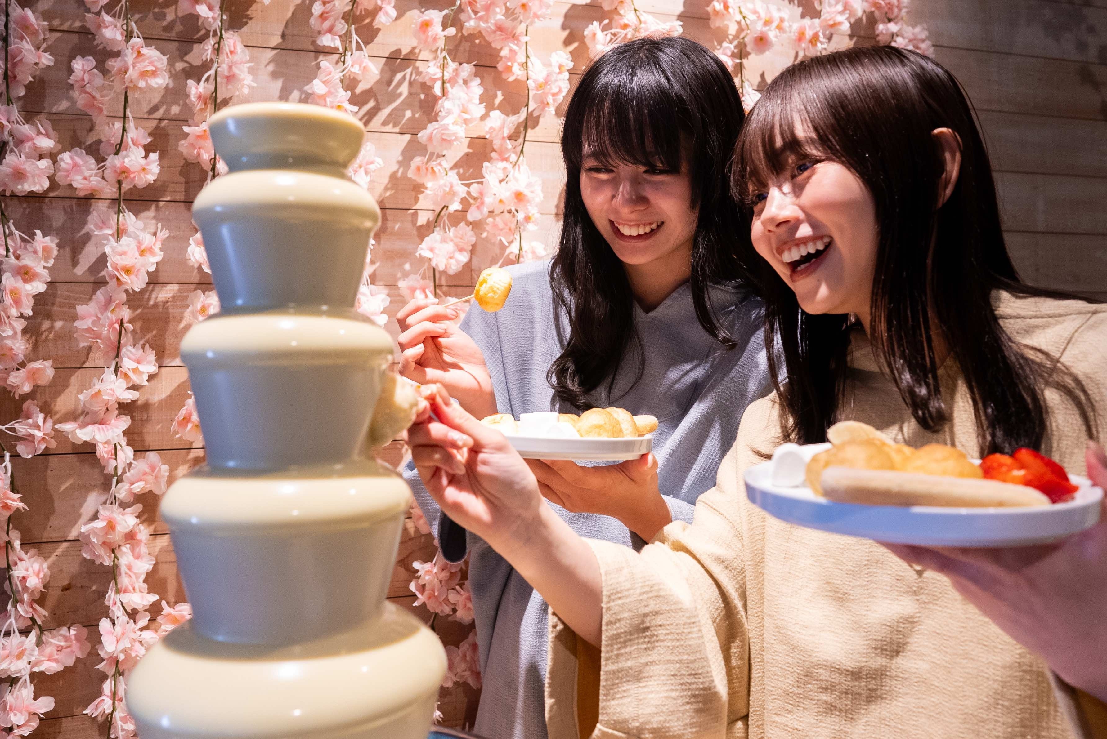 桜カーテンを背景に、ホワイトチョコにマシュマロやプチシュークリームなどをつけて楽しめるホワイトチョコファウンテンイベントを開催します。