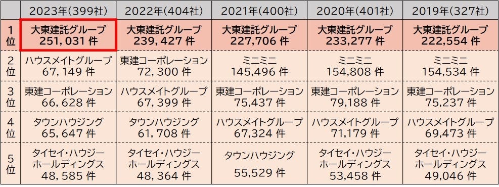 大東建託グループは、週刊全国賃貸住宅新聞(2023年1月2日発行号)にて発表された「2023 賃貸仲介件数ランキング 399社」において、第1位を獲得しました。同ランキングで当社グループが第1位を獲得するのは、今回で13年連続となります。