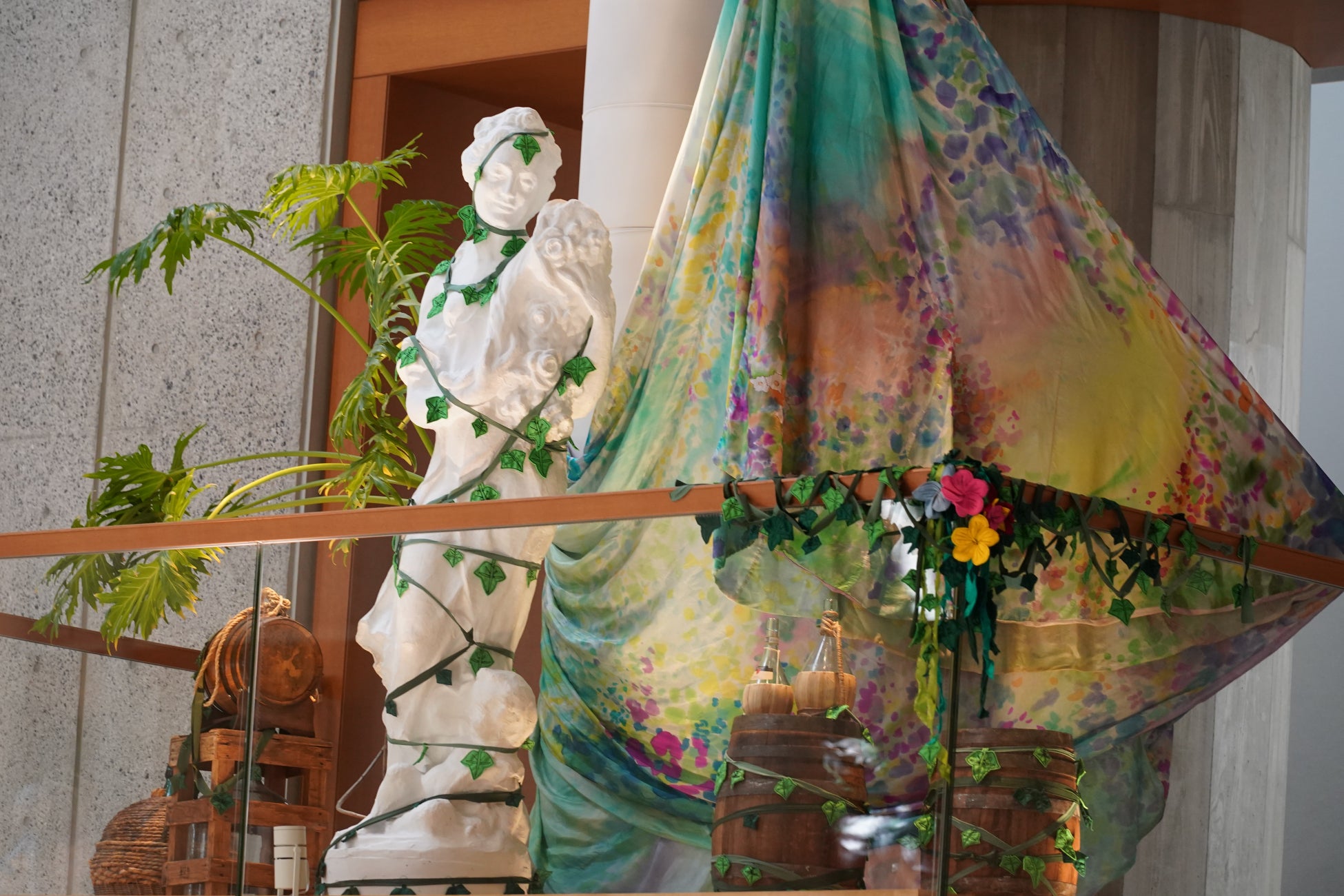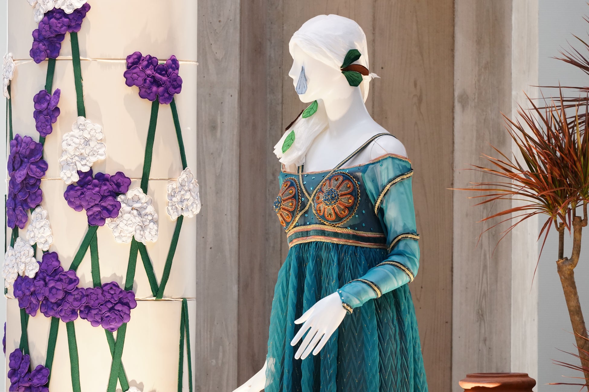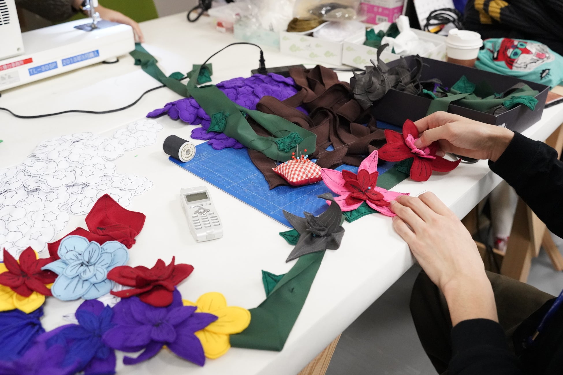 新国立劇場では2024年4月より、オープンスペースにおいて初台アート・ロフト衣裳展『針と糸で繋ぐ未来への扉』展を開催しております。この度、7月21日(日)、31日(水)に、本展示を手がけたクリエイティブチームによるワークショップを開催します。今回の展示では色鮮やかな花や蔦のモチーフが空間を飾っており、各コーナーにエッジを効かせています。約2000枚の花びらと約1500枚の蔦の葉は、ストレッチ布地に刺繍を施し、針と糸の手仕事により仕上げたものです。